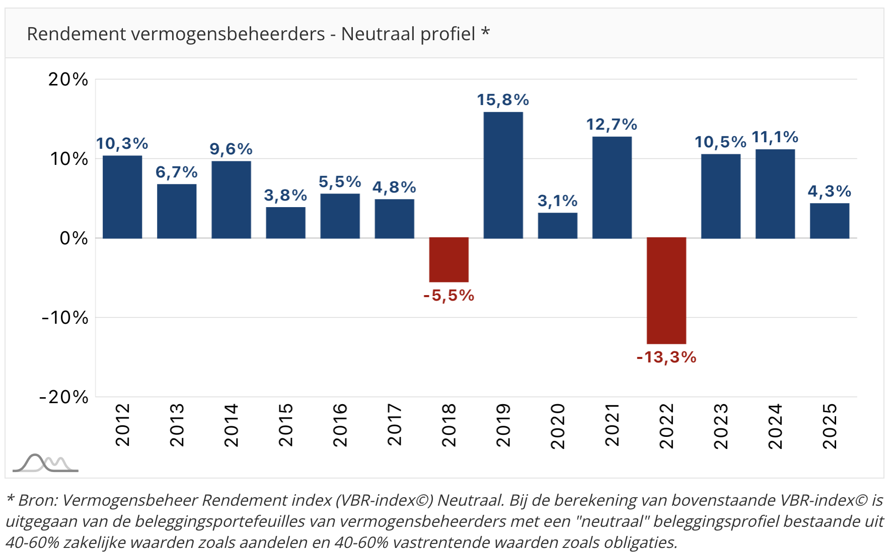 Gemiddeld realiseerden neutrale beleggingsportefeuilles van vermogensbeheerders in 2025 een netto rendement (na kosten) van +4,3%. Offensieve portefeuilles kwamen uit op gemiddeld +5,9%, terwijl defensieve portefeuilles gemiddeld +2,1% rendement behaalden. *